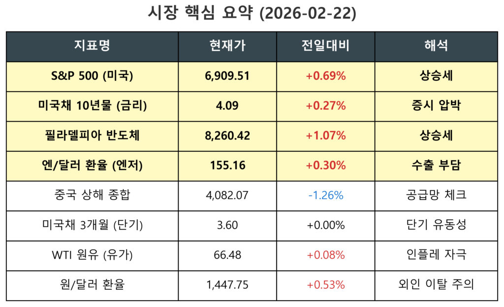 리스크/기회: 엔/달러 환율 상승(+0.30%, 엔저)으로 우리 수출 기업의 가격 경쟁력에 약간의 부담이 생겼고, 원/달러 환율(+0.53%) 또한 오름세를 보여 외국인 수급 이탈 여부를 예의주시해야 하는 리스크 요인이 남아있습니다.