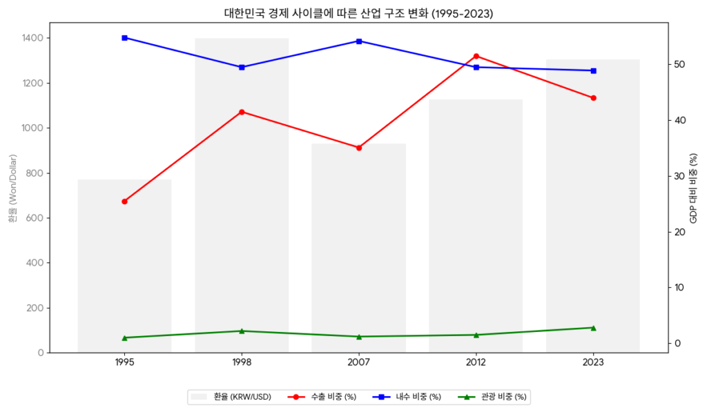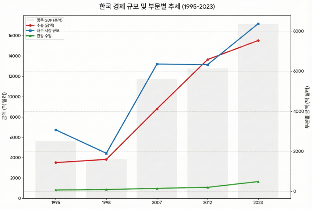 | 지표 | 1995 (성장기) | 1998 (IMF 위기) | 2007 (국내 호황) | 2012 (수출 정점) | 2023 (뉴노멀) |
